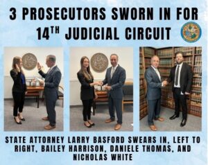 Three law graduates from as far away as Utah and as close as Bonifay were sworn in as prosecutors this week to handle cases in the 14th Judicial Circuit, State Attorney Larry Basford announced.