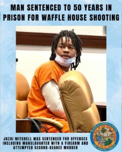 Mitchell was found guilty last month of killing 19-year-old JaDion Hughes. The evidence showed Mitchell robbed Hughes’ friend – Hughes was not armed – of a gun behind the Waffle House on June 3, 2025. The gun owner followed Mitchell back to his car and tussled with him trying to get his gun back. Hughes leaned in the car to calm things down. Mitchell fired a shot at the gun owner, but the bullet went through his jacket and into Hughes’ chest.